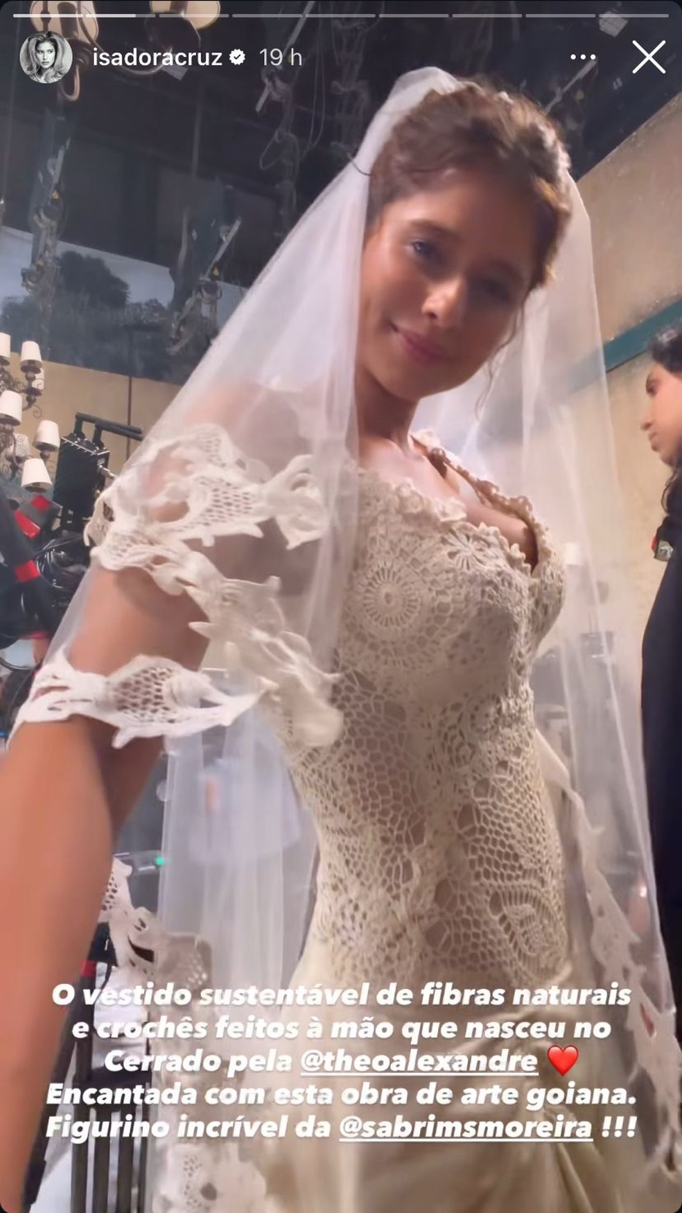 Nos bastidores das gravações, Isadora compartilhou um vídeo em suas redes sociais mostrando detalhes do figurino. Encantada com a peça, a paraibana destacou o caráter sustentável do vestido. “O vestido sustentável de fibras naturais e crochês feitos à mão que nasceu no Cerrado, criado pela @theoalexandre. Encantada com esta obra de arte goiana”, escreveu.
