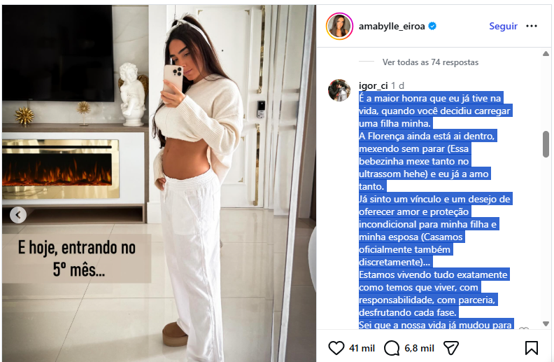 Igor Camargo se declara e Amabylle Eiroa em poste de gravidez: ‘É a maior honra’